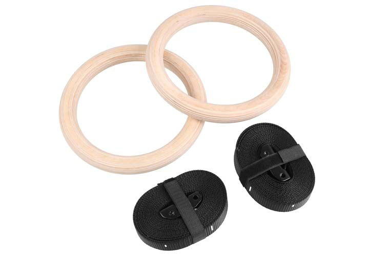 Coppia di anelli in legno, antisdrucciolo e di alta qualità con strap di 3,8 mm per una sicurezza assoluta. Carico massimo 300 kg, multifunzionale per esercizi come trazioni, flessioni, piegamenti, parallele ecc. Adatto per appassionati di tutti i livelli, sia in palestra che in casa.