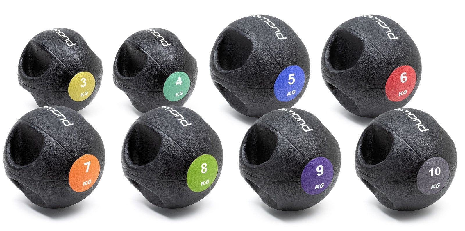 La palla medica “Double Grip” al contrario delle normali palle medicina è dotata di maniglie per maggior presa durante le diverse forme di allenamento. Questa particolarità permette di risparmiare le articolazioni e di ampliare la gamma di esercizi inserendo varianti monoarticolari.