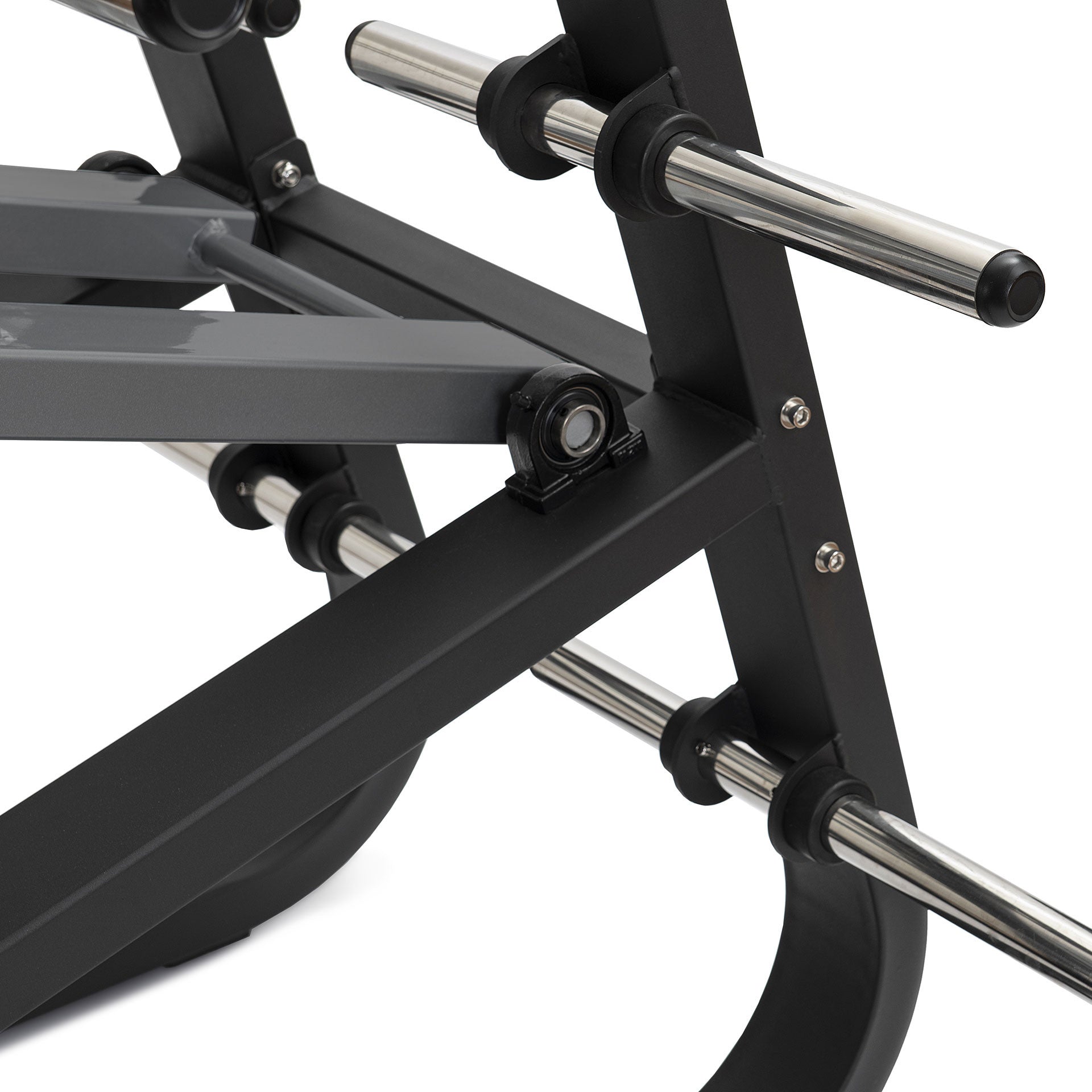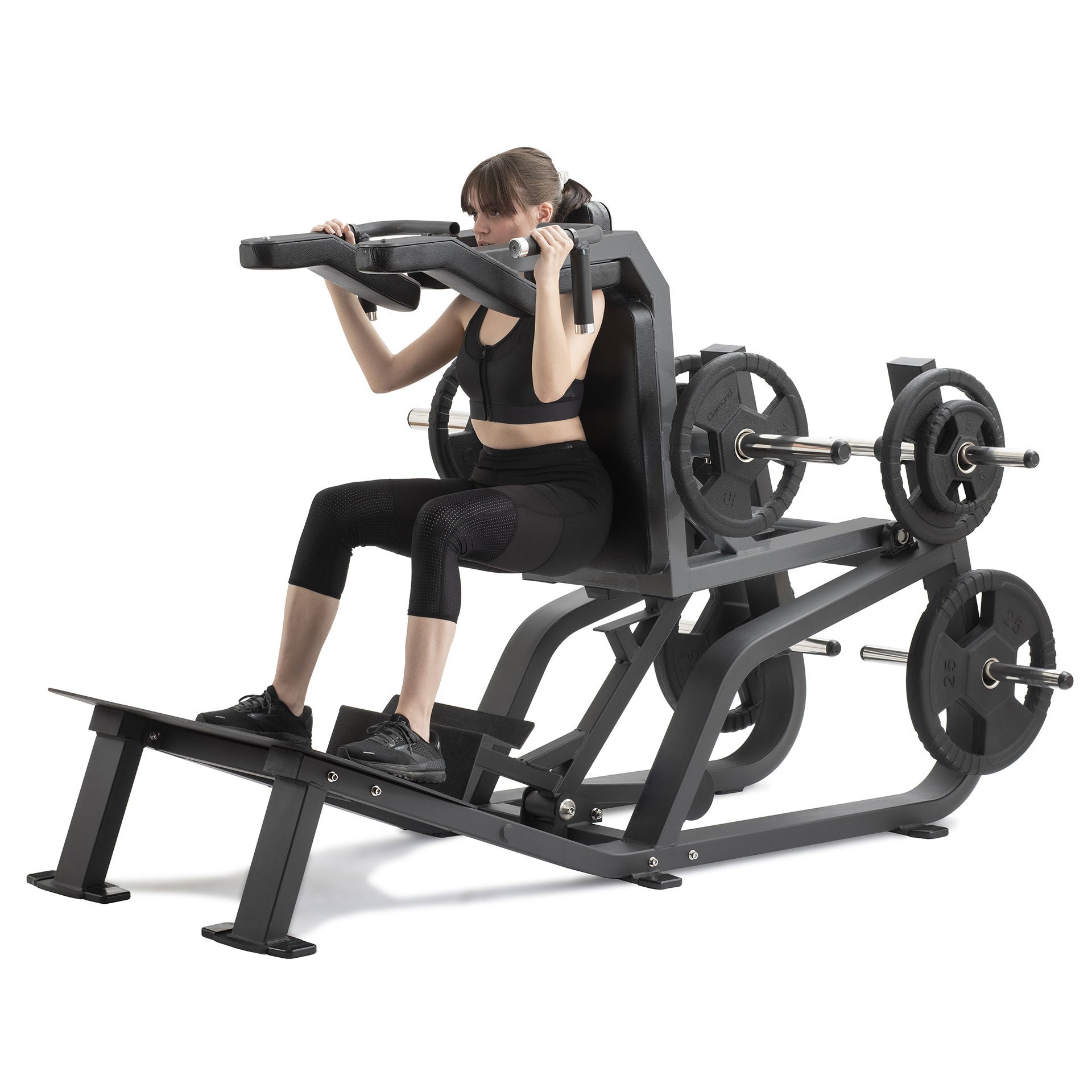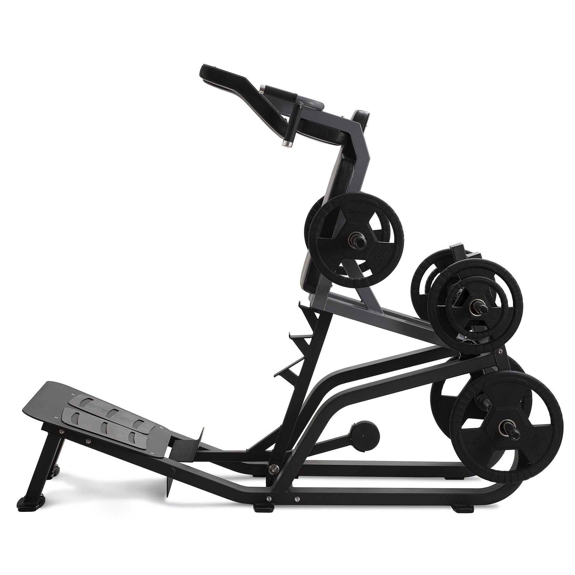 L??Hack Squat Çù una macchina per esercizi che viene utilizzata per l??allenamento della forza della parte inferiore del corpo, ed Çù progettata per replicare un movimento accovacciato e naturale. Grazie all??arco di movimento curvo, l??Hack Squat riduce il carico assiale e di conseguenza lo stress sul ginocchio e sulla schiena.