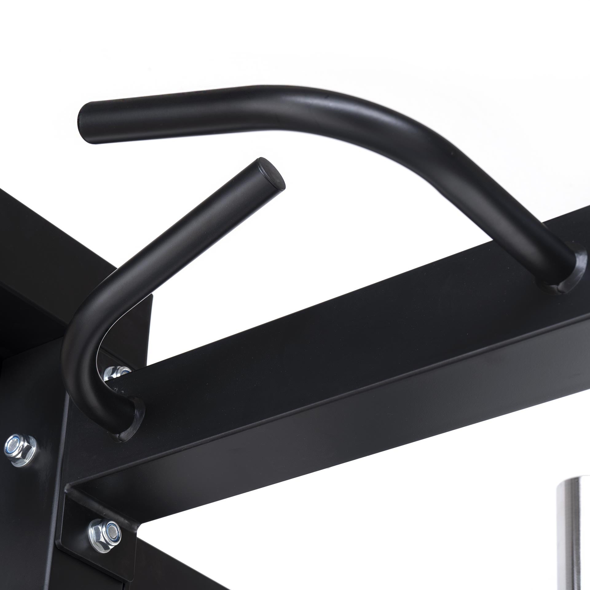 - Caratteristiche Struttura 75x75x3 mm. 35 fori per montante. 2 supporti bilanciere con protezione UHMW. 2 safety bar con protezione UHMW. 2 ganci superiori per band per lato. 3 perni inferiori per band per lato. 1 perno superiore per band per lato. 10 portadischi laterali. Doppia presa per trazioni. 2 porta biliancieri.