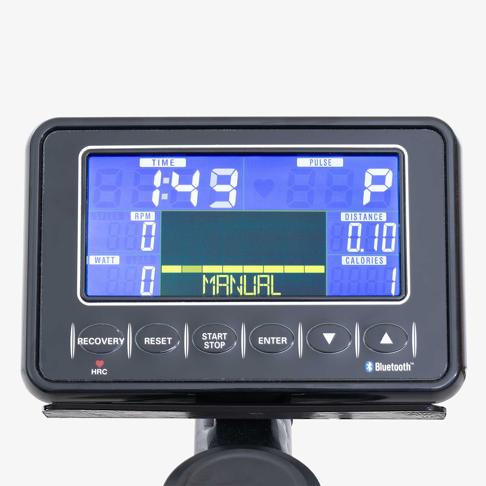 Il computer con un grande display a colori LCD da 7 finestre multi-informazione e una matrice grafica 8 x 12 pxl è inserito nella console con un supporto porta cellulare / tablet e permette di mantenere sotto controllo tutti i parametri dell’allenamento cardio, quali: tempo, distanza, velocità, RPM, calorie, Watt, frequenza cardiaca, n° livello resistenza, visualizzazione profilo programma. La gym bike JK 564 è dotata di un sensore nella console per rilevare la frequenza cardiaca dell’utilizzatore tramite la fascia cardio durante le sessioni di un allenamento cardio più intenso; la fascia cardio è offerta di serie.