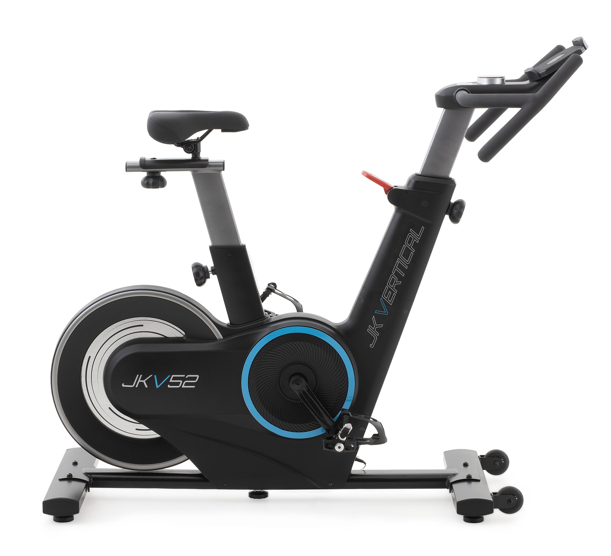 La nuova spin bike JKV 52 entra al vertice della gamma JK Fitness Vertical migliorando le prestazioni complessive rispetto alla gamma precedente: più comfort, più sicurezza, maggiori prestazioni con un look total black più dinamico e sportivo grazie al volano posteriore e la nuova consolle