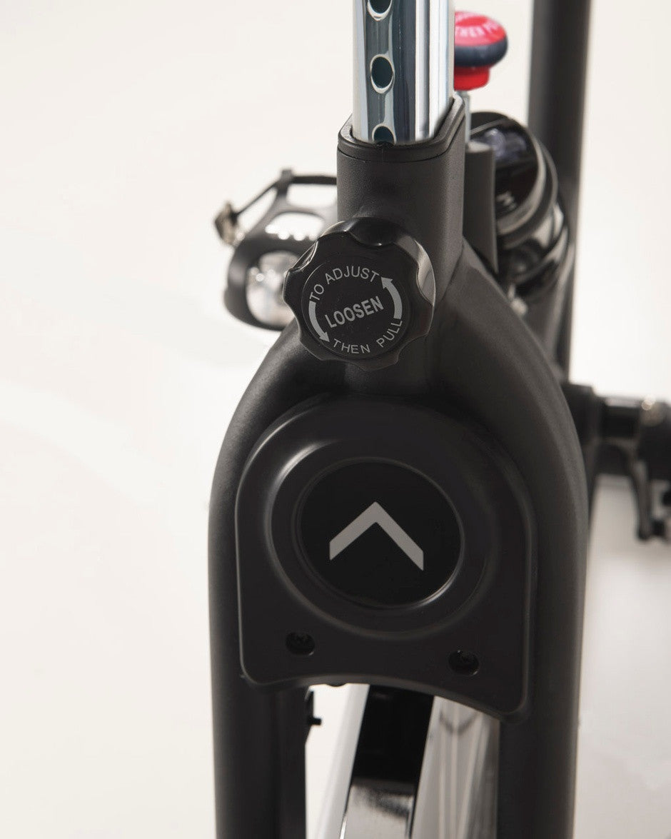 La bike ha una sella bicolore con regolazione verticale e orizzontale. La regolazione dello sforzo è manuale micrometrica. La Spin bike ha una struttura in acciaio ad alto spessore verniciata a polveri ad alta resistenza. La rilevazione del battito cardiaco avviene tramite appositi sensori collocati sul manubrio. Il manubrio si può regolare verticalmente e grazie alle ruote poste nella parte anteriore dell’attrezzo si può spostare facilmente da una stanza ad un’altra e sempre alla base sono posti dei piedini di livellamento.
