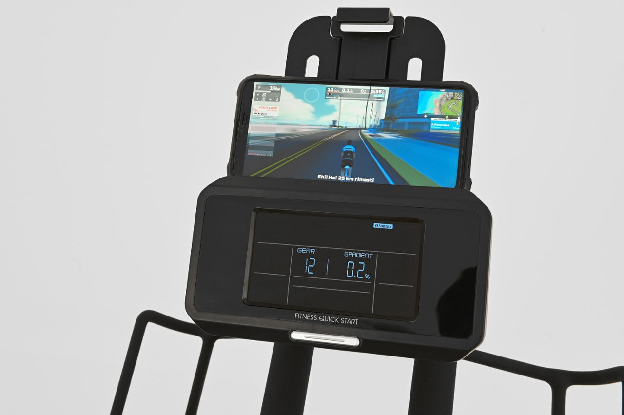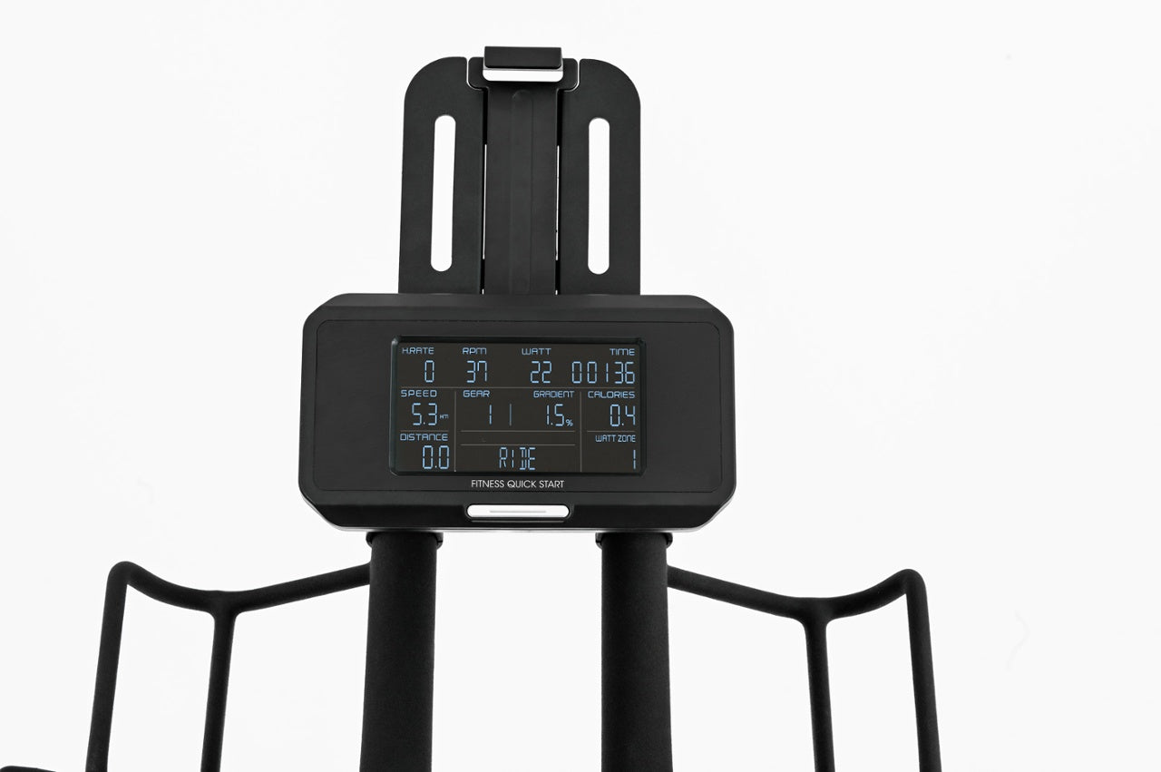 Computer con LCD Il display LCD retroilluminato della REBEL offre una visibilità ottimale in ogni condizione di illuminazione, permettendo di monitorare facilmente tutti i parametri dell'allenamento. Console Inclinazione regolabile micrometrica. Supporto per smartphone e tablet in dotazione. Informazioni tempo, RPM, velocità, calorie, Watt, HR Zone, Watt Zone, SP, VI, SV, EPV. Inclinazione: sincronizzata ed interattiva (APP) in modalità bike.