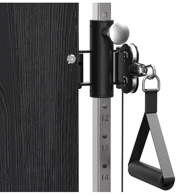 Poliercolina ultra compatta dual pulley con pacco pesi in acciaio da 50 kg selezionabili su 20 step da 2,5 kg, superficie anteriore con finitura in acero grigio con venature naturali, sistema di carrucole con pulegge Ø 50 mm in alluminio anodizzato con cuscinetti a sfera ad alta scorrevolezza. Cavi di trazione in acciaio con rivestimento in poliuretano Ø 3,3 mm, due maniglie con impugnatura antiscivolo e moschettone a sgancio rapido di sicurezza, prodotto salva spazio da collocare su una parete con minimo ingombro, telaio verniciato a polvere epossidica antigraffio.