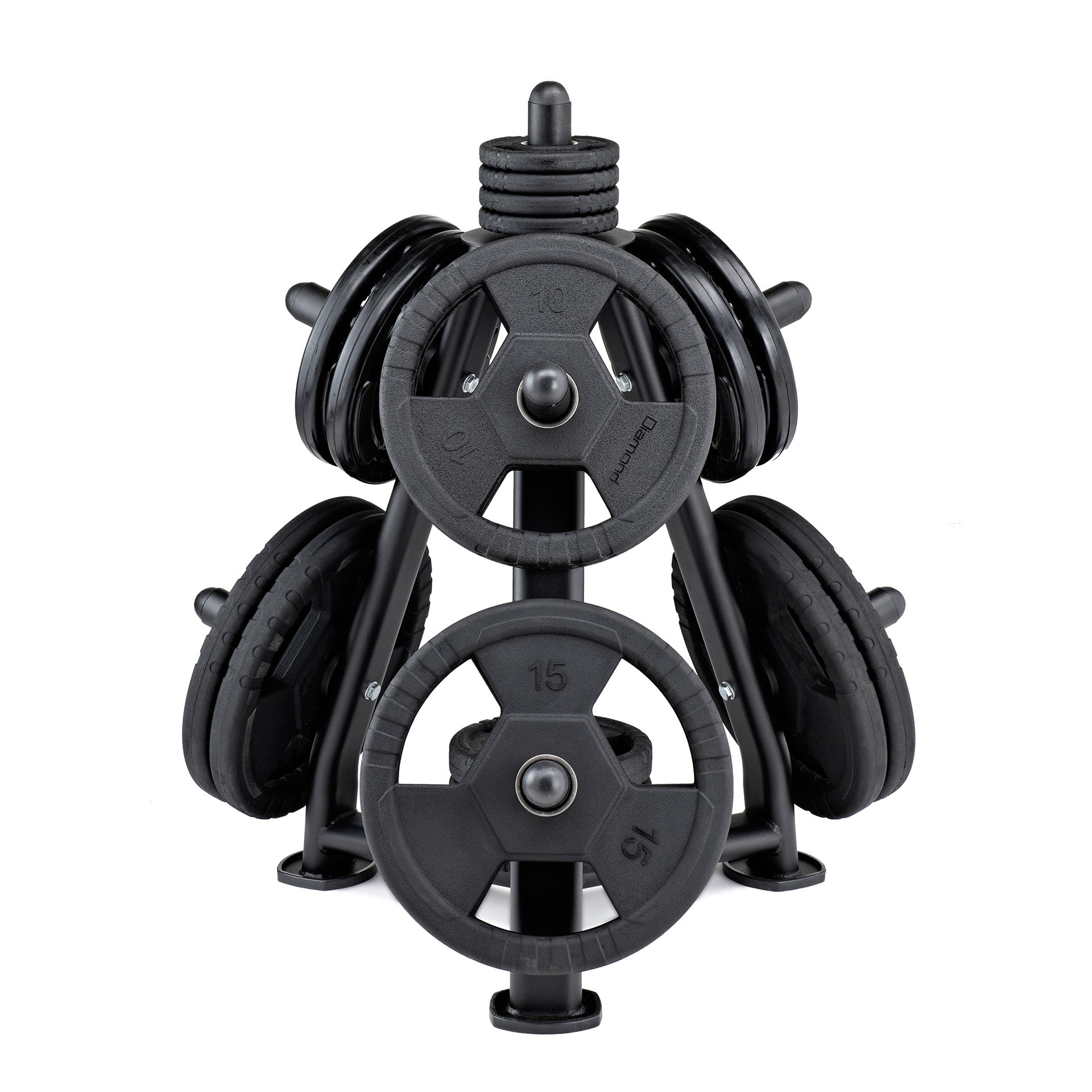 La rastrelliera RD50 ha una struttura ad albero con 3 braccia e 6 perni orizzontali per l’alloggiamento di dischi con foro 50 mm. Oltre ai perni orizzontali presenta altri 2 perni, posti verticalmente, utilizzabili con dischi di piccola taglia o, in alternativa, collari per i bilancieri. Lo storage ha delle dimensioni relativamente contenute per la capacità di carico che può contenere, 60 x 60 x 100 cm, rendendolo la soluzione ideale per i migliori centri fitness.