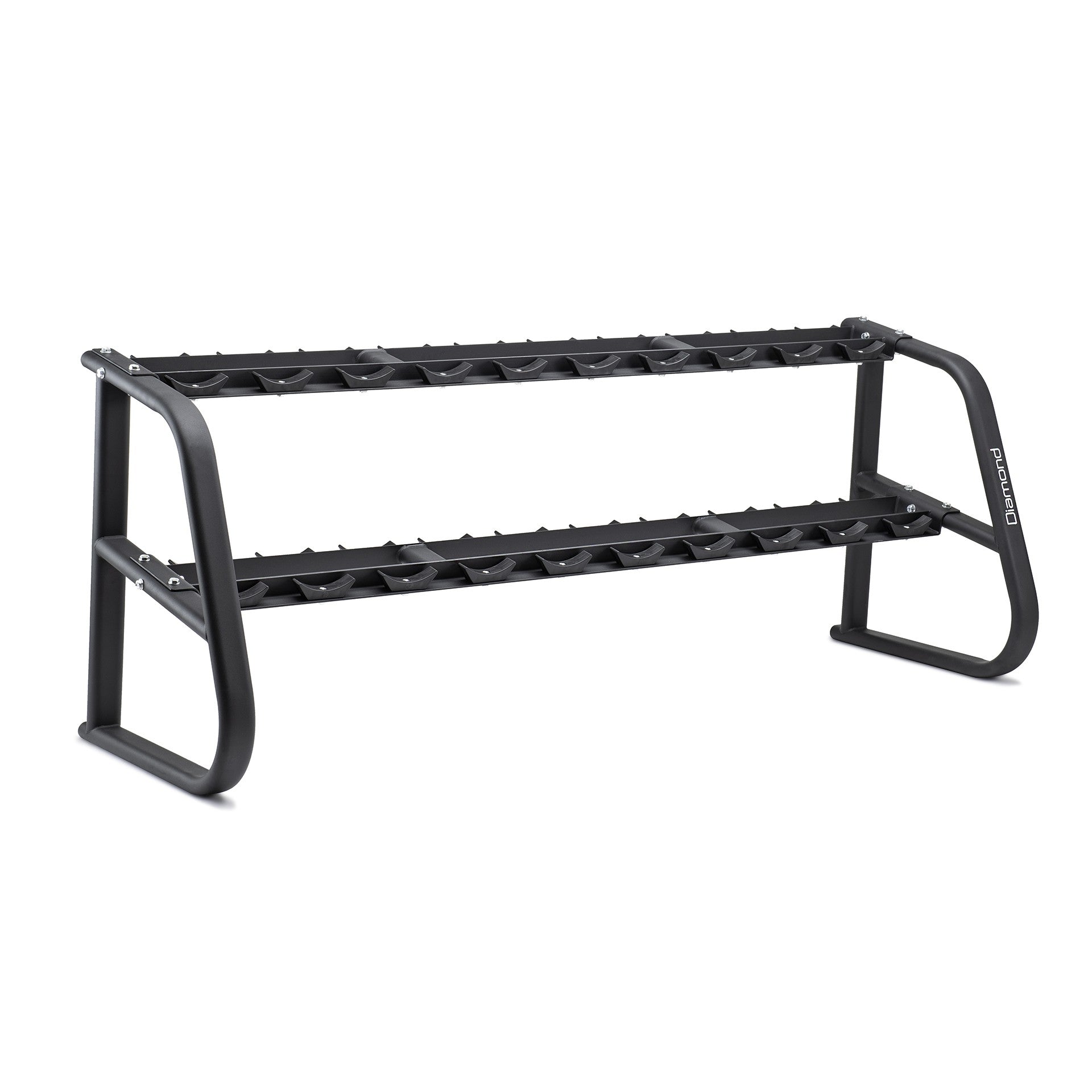 La rastrelliera manubri a 2 ripiani RMD-2R, contiene fino a 10 coppie di manubri con terminale tondo se montato con le sedi in dotazione. Non applicando le suddette sedi è possibile alloggiare anche i manubri con testa esagonale. La sua poliedricità di utilizzo coadiuvata da una struttura importante con telaio a sezione ovale e dimensioni di 230 x 74 x 90 cm per 59 Kg di peso, la rendono lo storage ideale per i migliori centri fitness.