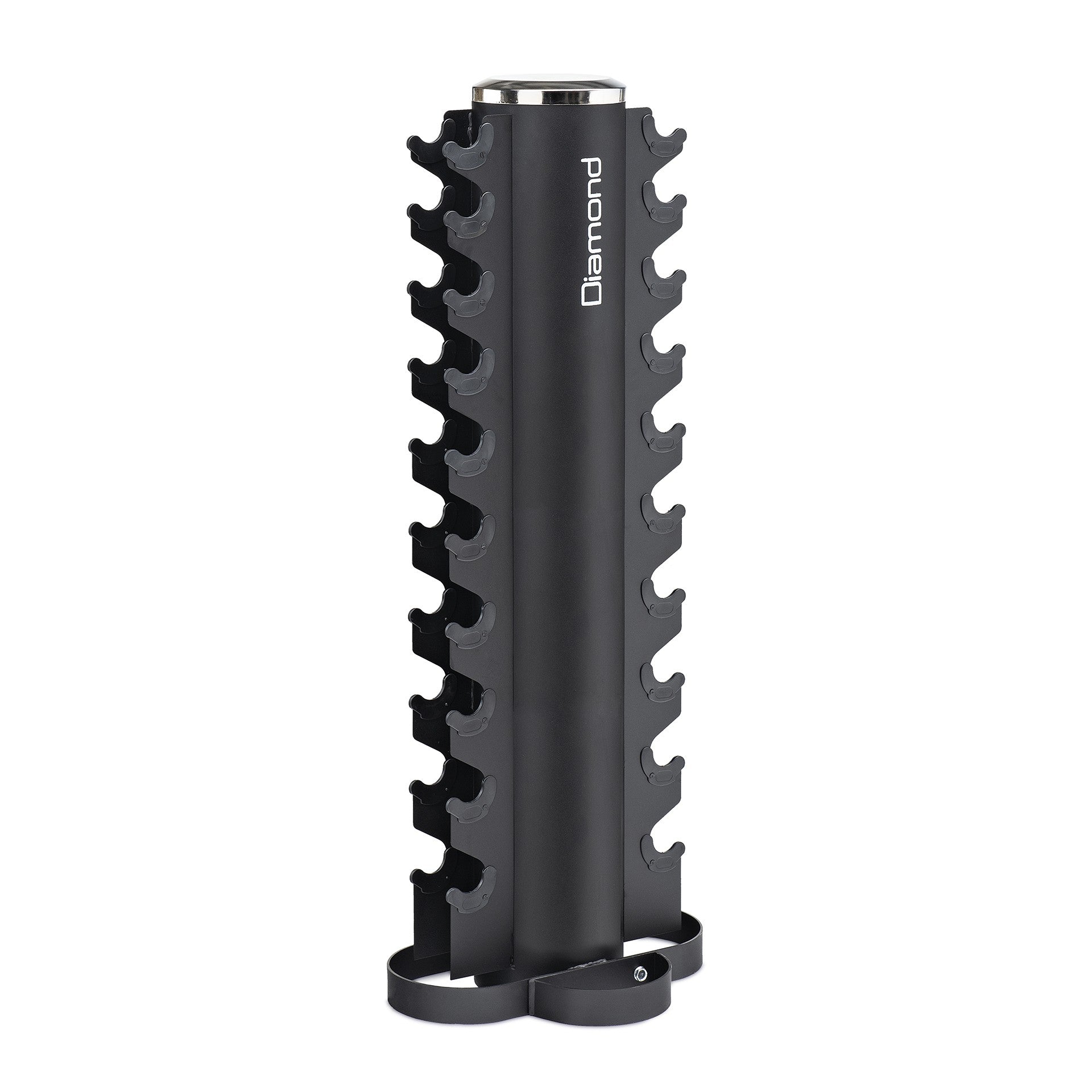 Rastrelliera verticale a colonna per alloggiamento di 10 coppie di manubri di piccolo/medio taglio. Può ospitare manubri di qualsiasi tipologia e/o testa, aventi come lunghezza di impugnatura 9,5 cm o superiore. Grazie alla protezione in materiale plastico nella sede dell’alloggiamento, salvaguarda lo stato e l’usura dei manubri. Il design elegante di questo storage lo rende la soluzione ideale per tutte quelle boutique del fitness che vogliono offrire il miglior servizio ai loro clienti.