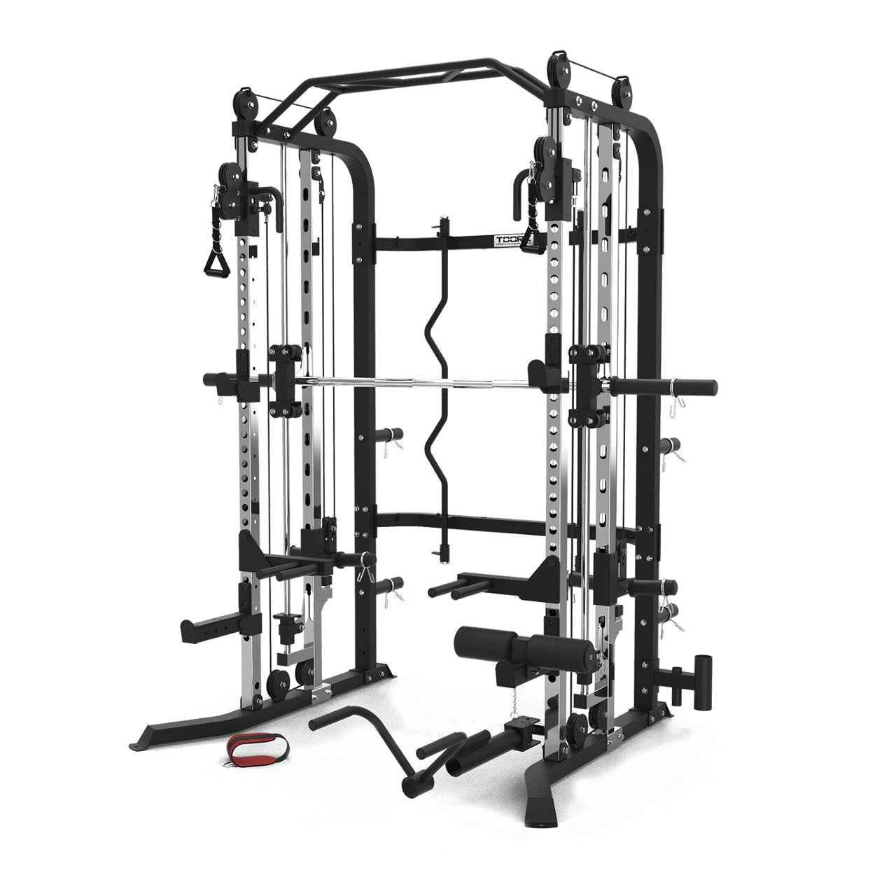 - Dotazioni 3-IN-1 dual pulley, smith machine, rack. 2 J-hook, coppia fermi di sicurezza bilanciere con rulli gambe in foam, barra trazioni, parallele, porta bilanciere, 4 porta dischi ø50 mm e 25 mm, 10 ferma dischi a molla ø49 mm, 10 ferma dischi a mola ø47 mm. Attachments : cavigliera, landmine, 2 maniglie trazioni, bilanciere curl.