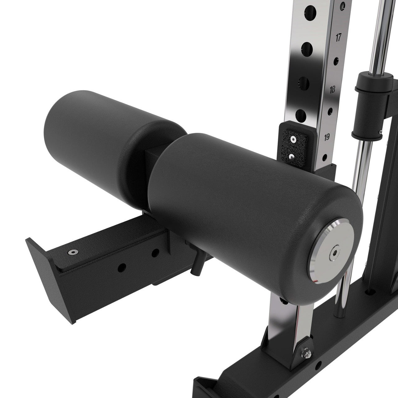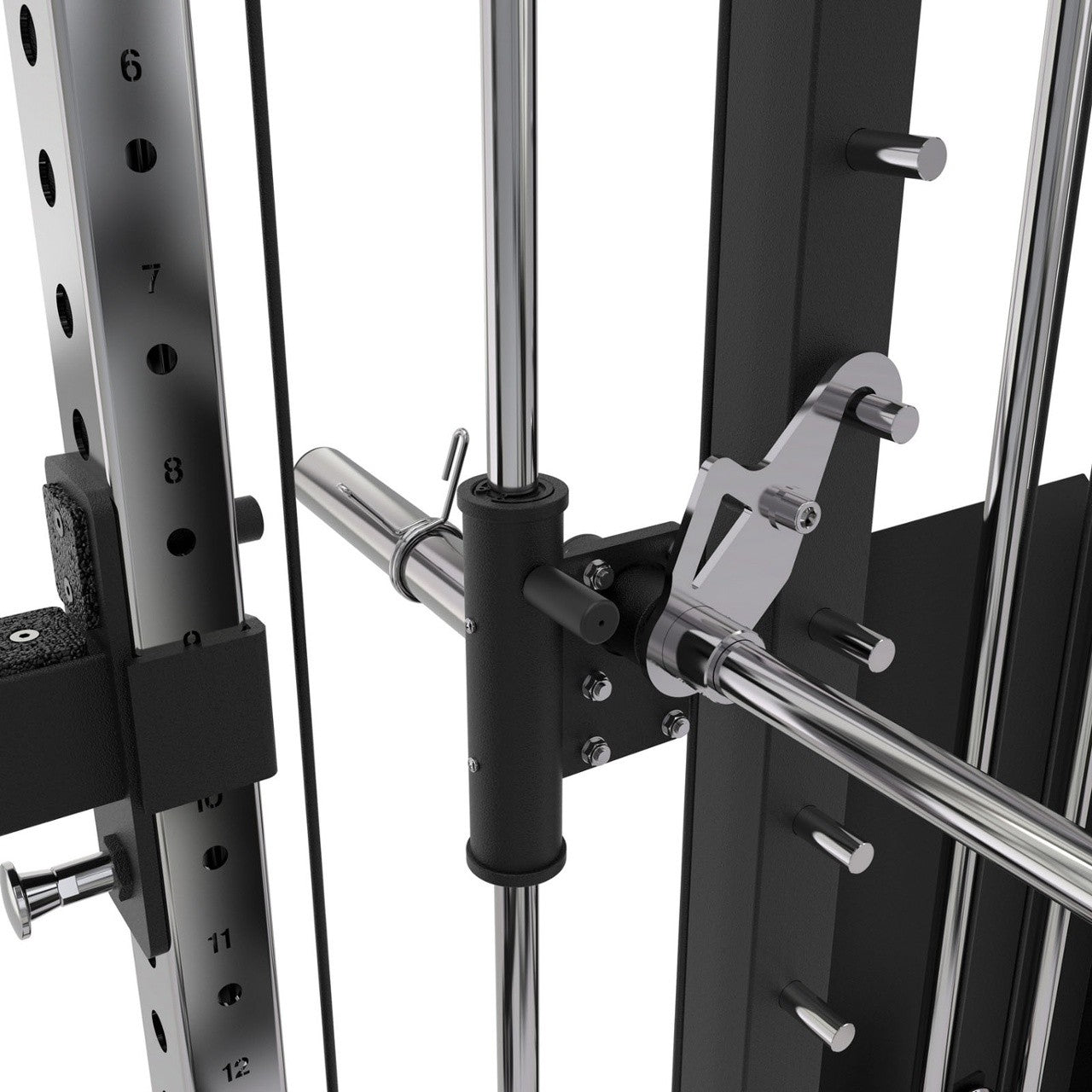 Diametro porta dischi da 50 mm - Dotazioni 3-IN-1 dual pulley, smith machine, rack. 2 J-hook, coppia fermi di sicurezza bilanciere, barra trazioni, parallele, porta bilanciere, 6 porta dischi ø50 mm, 8 ferma dischi a molla ø49 mm. Attachments: cavigliera, corda doppia tricipiti, catena, landmine, 2 maniglie trazioni, pedana antiscivolo, maniglia doppia, barra tricipiti, bilanciere e bilanciere CURL