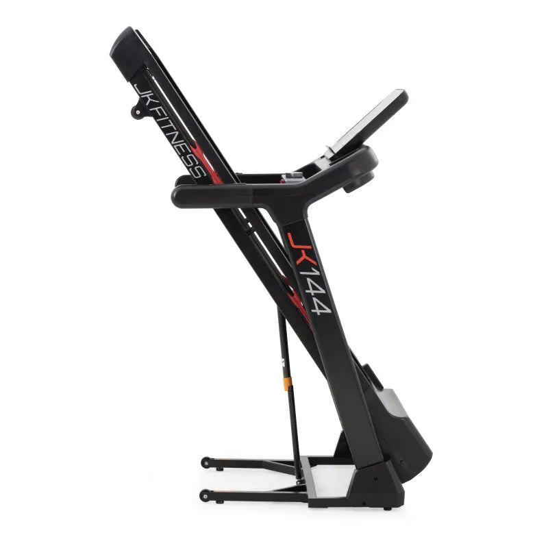 Il JK 144 è un tapis roulant richiudibile. La sua struttura robusta in acciaio (73 kg) permette l’uso a persone fino a 130 kg; la struttura richiudibile “salva-spazio” permette di ridurre l’ingombro del tapis roulant quando non viene usato (in uso 185 x 78 x 142 cm; chiuso 112 x 78 x 164 cm); in dotazione 2 ruote per il trasporto che facilitano i piccoli spostamenti dell’attrezzo da un locale all’altro. JK Fitness offre i migliori tapis roulant sul mercato con un perfetto rapporto qualità/prezzo.