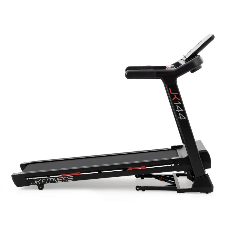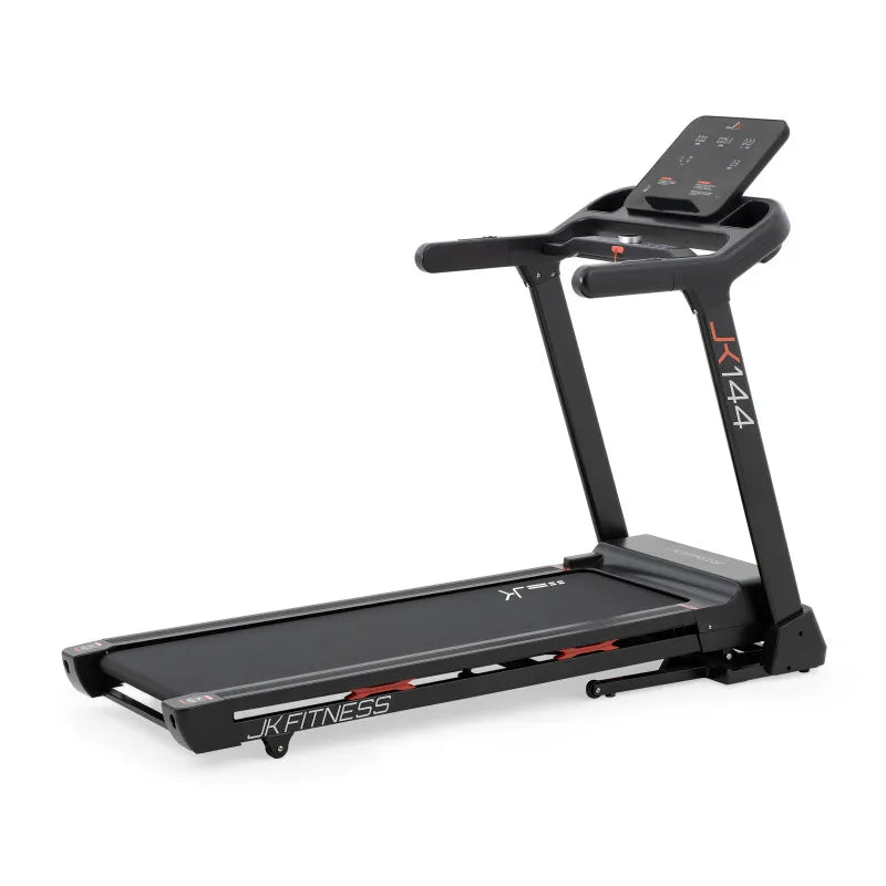 Il JK 144 è un tapis roulant elettrico di fascia media nel mondo home fitness equipaggiato con un potente motore da 3.25 HP con un picco massimo di 4.25 HP che permette di raggiungere una velocità di 22 km/h, con regolazione ad incrementi one-step di 0,1 km/h. Il JK 144 è dotato di una inclinazione elettrica su 20 livelli, che permette di raggiungere una pendenza del 12% per stimolanti camminate in salita. Per la massima facilità d’uso dell’utilizzatore il JK 144 è dotato di una serie di pulsanti a comando rapido per velocità ed inclinazione, pratici per far eseguire repentine variazioni della prestazione all’utilizzatore senza distrazioni. L’ampia superficie di corsa di 48 x 149 cm, con nastro spesso 1,6 mm anti-slip, permette confortevoli allenamenti in piena sicurezza grazie anche al sistema di ammortizzazione comfort flex system con 4 elastomeri a X, che riesce a limitare i piccoli microtraumi dovuti all’impatto del piede durante la camminata e la corsa.