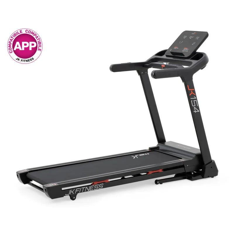 Il JK 154 è un tapis roulant elettrico di fascia media nel mondo home fitness equipaggiato con un potente motore da 3.5 HP con un picco massimo di 4.5 HP che permette di raggiungere una velocità di 22 km/h, con regolazione ad incrementi one-step di 0,1 km/h. Il JK 154 è dotato di una inclinazione elettrica su 20 livelli, che permette di raggiungere una notevole pendenza per stimolanti camminate in salita. Per la massima comodità dell’utilizzatore il JK 154 è dotato di una serie di pulsanti a comando rapido per velocità ed inclinazione, pratici per far eseguire repentine variazioni della prestazione all’utilizzatore senza distrazioni. L’ampia superficie di corsa di 53 x 152 cm, con nastro spesso 1,6 mm anti-slip, permette confortevoli allenamenti in piena sicurezza grazie anche al sistema di ammortizzazione comfort flex system, che riesce aa attenuare i piccoli microtraumi dovuti all’impatto del piede durante la camminata e la corsa.