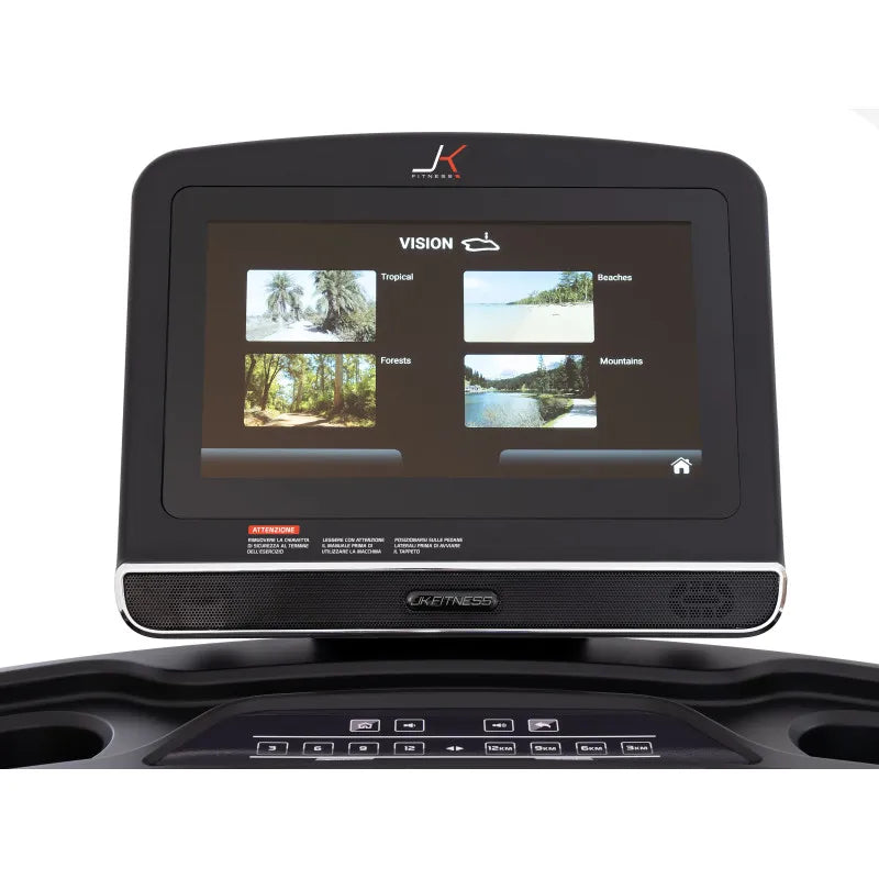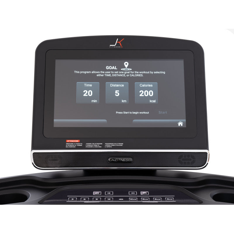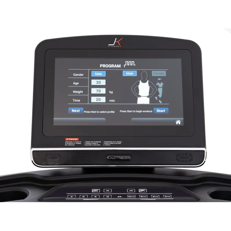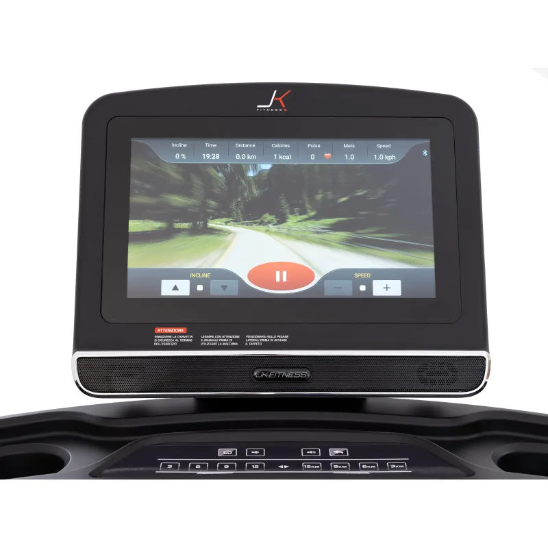 Il grande schermo LCD touch-screen da 15,6” del nuovo JK 194 PRO ben armonizzato nella console, permette di monitorare tutti i parametri dell’allenamento cardio quali: tempo, distanza, velocità, inclinazione, calorie bruciate, n° passi, frequenza cardiaca. Il tapis roulant JK 194 PRO è dotato di due sensori integrati: ricevitore per collegare i propri devices elettronici (per APP, social e musica); e ricevitore 5.3 kH per la rilevazione della frequenza cardiaca tramite la fascia cardio toracica JK offerta di serie.