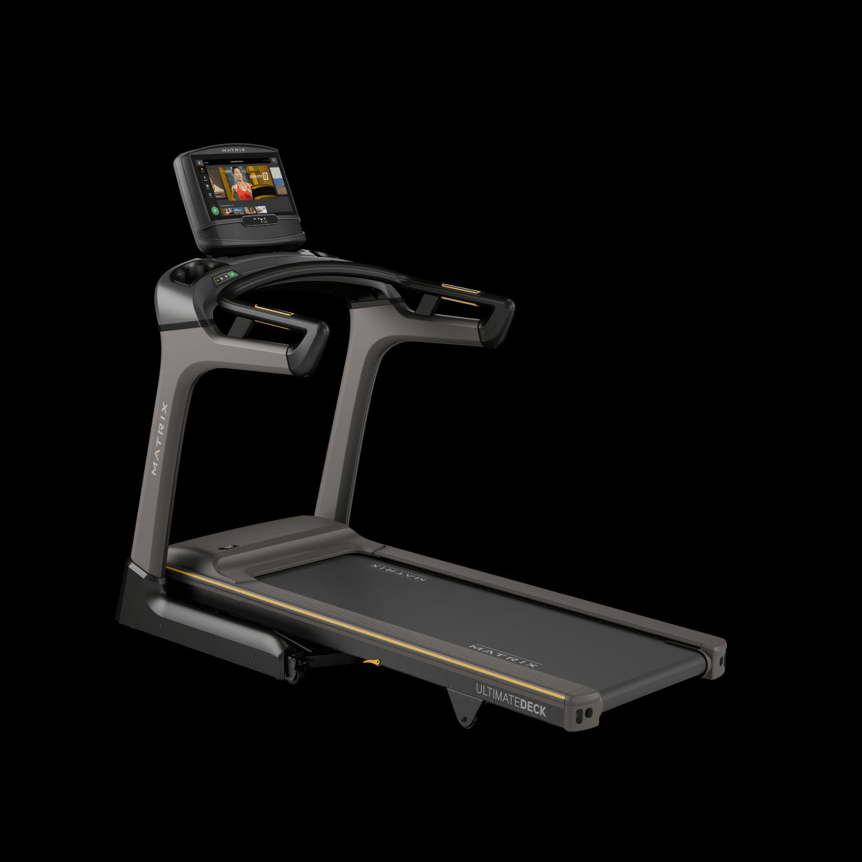 Ampia superficie di corsa con pedana ammortizzata con Ultimate Deck System, motore a corrente continua, velocità fino a 20 km/h ed inclinazione elettrica su 15 livelli, display con finestra Touchscreen 16” telaio con la pedana che può essere sollevata per ridurre lo spazio.
