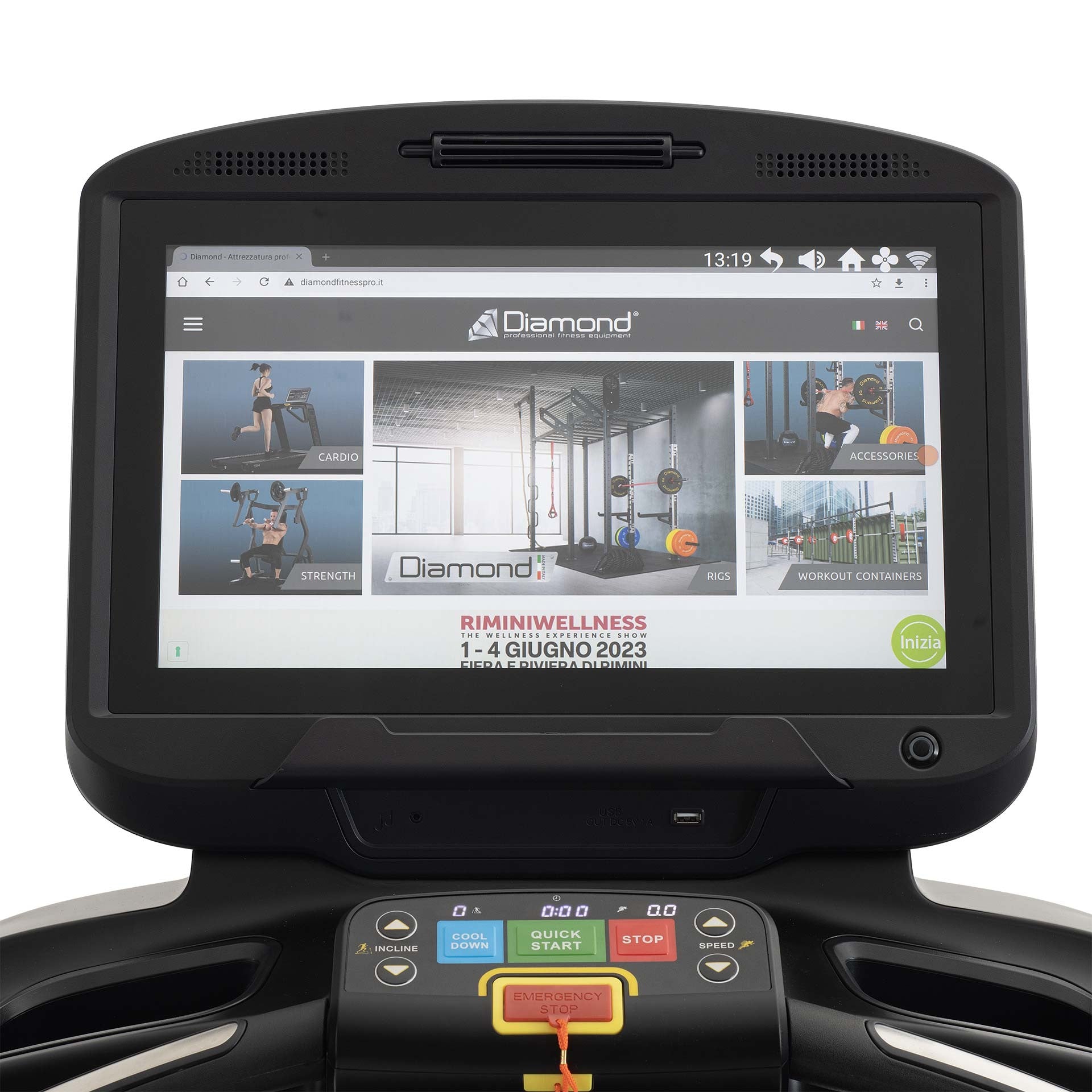 La console interattiva del Tapis Roulant T95 Diamond è dotata di uno schermo LCD touch screen HD 19,5'', che permette di monitorare tutti i parametri dell'allenamento in tempo reale, tra cui velocità, distanza percorsa, calorie bruciate e frequenza cardiaca. Inoltre, è compatibile con app di fitness e dispositivi Bluetooth, consentendo di ascoltare musica, guardare video e sincronizzare i propri progressi con le piattaforme di fitness più popolari.