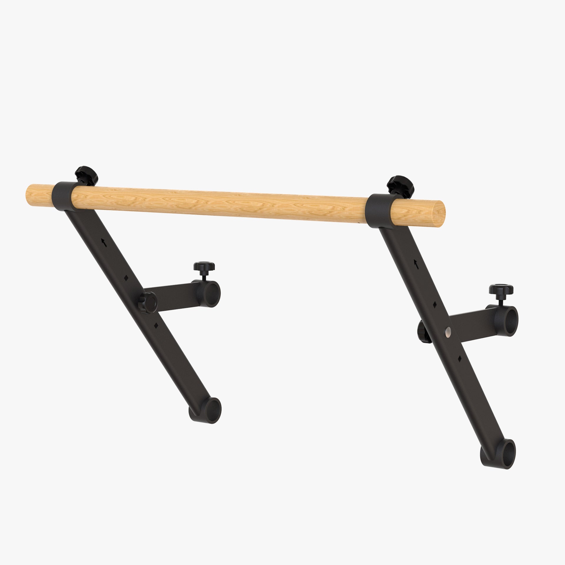 Il modulo superiore “wally bar” si aggancia e regola facilmente ai pioli più alti della spalliera JKV-SP per avere una stabile barra per trazioni in legno, utilizzabile per tutti gli esercizi di trazioni, sospensione o con l’uso di elastici (H barra da terra 220 cm circa).